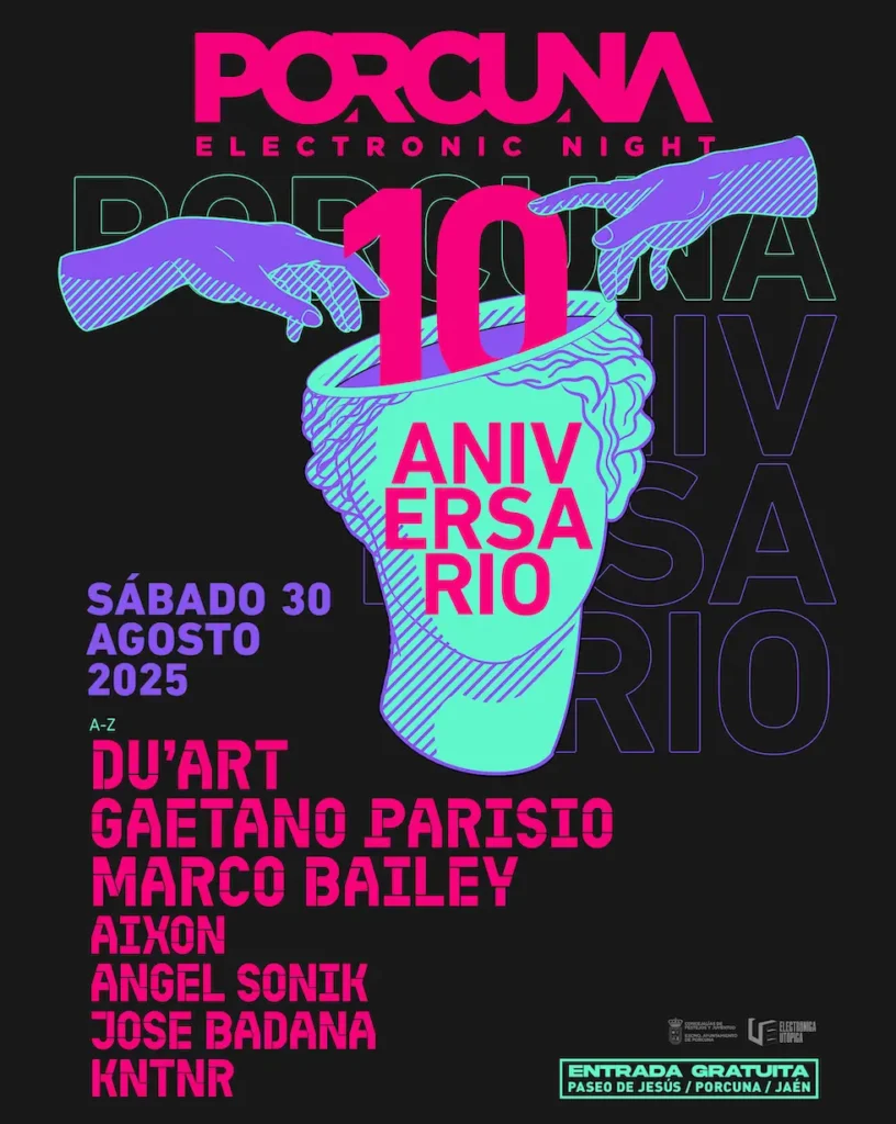 Y tras un gran recorrido, en el que el evento jiennense ha ido evolucionando y, sobre todo, creciendo con el paso del tiempo, el 30 de agosto de 2025 tiene lugar una cita muy especial. Porcuna Electronic Night celebra su décimo aniversario con una propuesta muy atractiva, manteniendo la línea equilibrada que caracterizan sus line-ups: clásicos del género (Gaetano Parisio y Marco Bailey), artistas internacionales (Du’Art), artistas emergentes (Aixon) y DJs locales (KNTNR, Ángel Sonik y José Badana). También, durante los días previos, se llevarán a cabo diversas actividades paralelas como talleres de iniciación al deejaying, DJ sets y una exposición que repasa la propia trayectoria del festival.